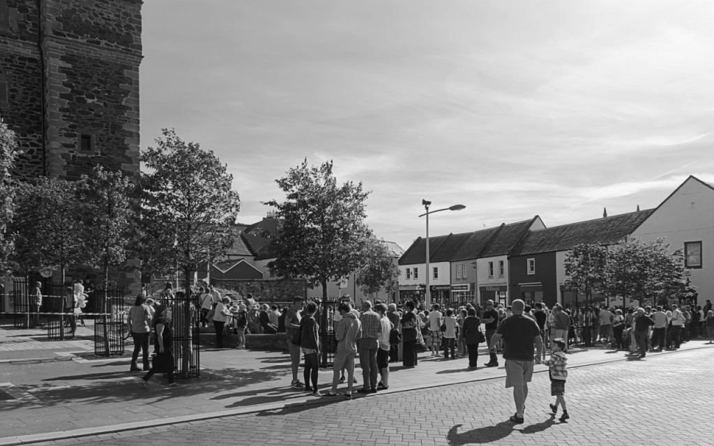 Last Thursday tea-time, the Queen’s Baton came to Stranraer as part of the run-up to the Commonwealth Games. It was quite fun to watch the crowds milling around in anticipation – arguably made for more interesting street-photos than the baton itself.