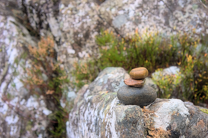 There’s an impressive outcrop of rocks (psammite and semi-pelite, looking rather like limestone) near the waterfalls in the River Affric. Some kindly soul had balanced these pebbles on a boulder on their way past previously.