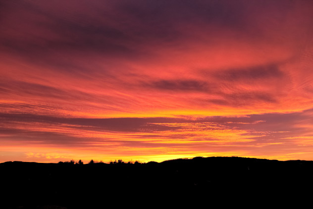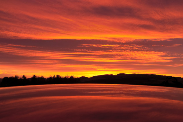 In the evening of Feb 7 2015, I was driving back along the A90 from Dundee to Perth, right into this sunset. It lasted a while, so I pulled over beside the road in the Carse of Gowrie to shoot it, including a reflection in the car roof (as one does!).