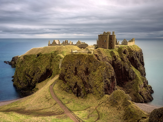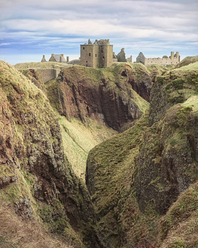 The ruins of the castle are surrounded by steep cliffs that drop to the North Sea, 50 metres (160 ft) below. A narrow strip of land joins the headland to the mainland, with a steep path leading up to the gatehouse.