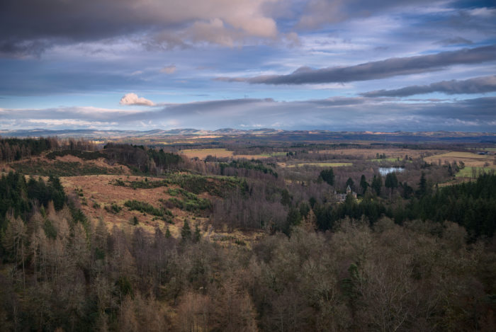 And finally, as far up the hills as I wanted to go that day, at Stair Bridge Viewpoint I was rewarded with a clear landscape vista over Rohallion Lodge to the Lowlands to the south: