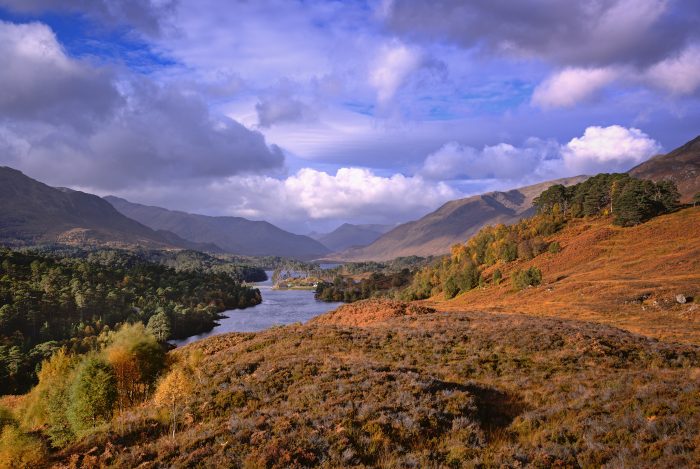 It’s definitely an autumn morning location: the sun rises behind you, skimming up and over the tops of mountains beyond Loch Beinn a’Mheadhoinn, rising as it heads south; accordingly, patches of bright sunlight interspersed with cloud-shadows lap like waves across the undulating landscape from distance right over you.