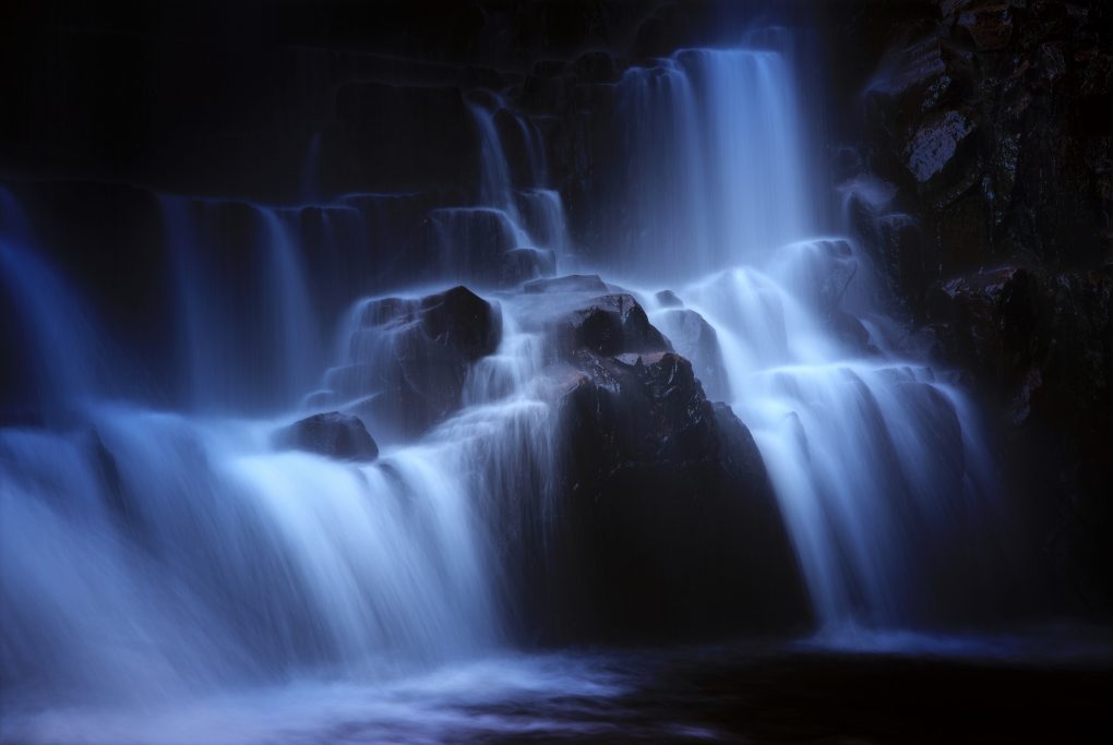 Having seen photos online of the Wailing Widow waterfall very near to the road, as the Allt Chranaidh leaves Loch na Gainmhich, I spent hiked over to the edge of the loch and, faced with a stiff wind and slippery frozen peat-bog underfoot, decided it wiser to approach the falls from the bottom of the 30m gorge instead. Not the easiest terrain either way – many large boulders, some slipped down from the sides of the gorge, requiring scrambling to cross with tripod and camera gear. From the little carpark barely off the road, there’s just a moderate river running away: