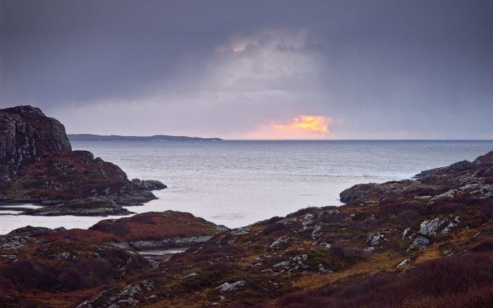 Driving the last stretch of the road to Achmelvich, the sun set right in front of me, a large orange-red ball above the water. The combination of colours, cold blue slate grey sky and warm yellow-orange heather, coupled with the sea breeze put me in mind of a fine west-coast single malt whisky…