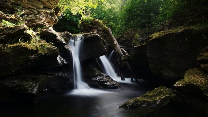 An overview of the waterfalls at Edinample – lovely sunlight illuminating the rocks nearby