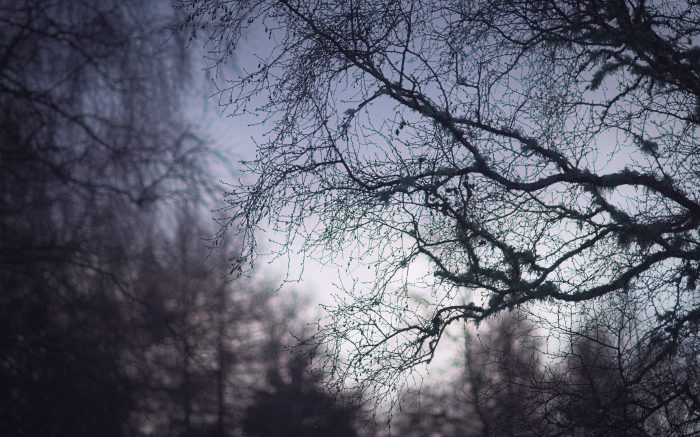 Detail of tree twigs and filigree – lichen-covered branches silhouetted against the low winter sun.