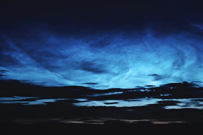 Noctilucent (“night-shining”) clouds are the highest in the atmosphere, at around 76-85km altitude. They only appear in the summer months at latitudes from 50-70º (north or south), when the sun is more than 6º below the horizon. Formed in the mesosphere at very cold temperatures from ice, dust and water vapour, their gossamer threads undulate and shimmer in shades of electric blue.