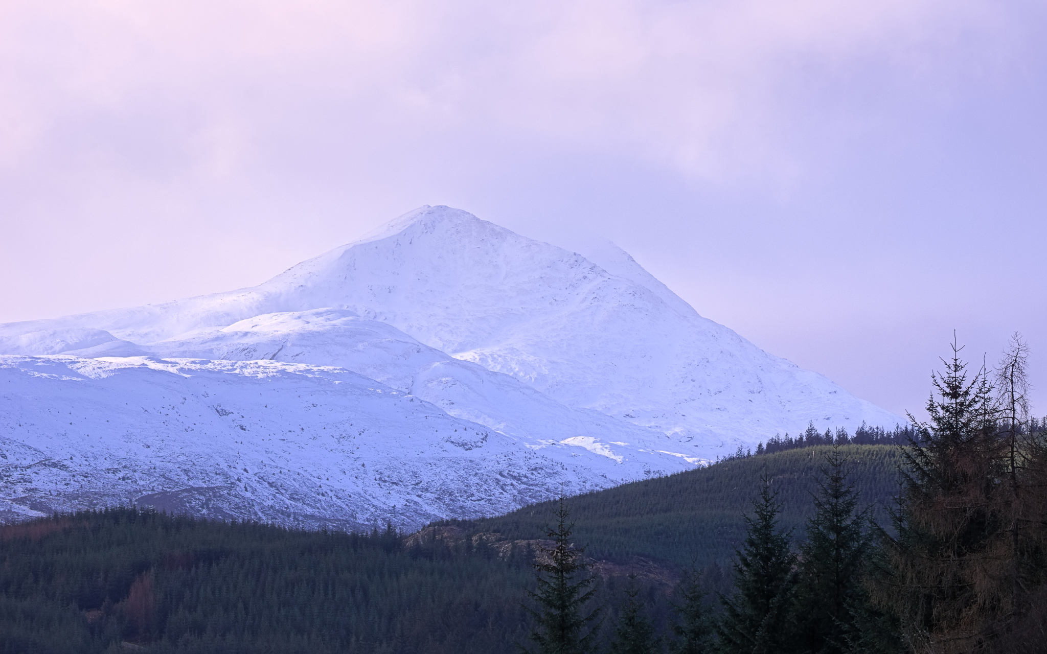 Classic views - the familiar pointy triangular shape of a snow-covered Ben Lomond with its head in the clouds, from...